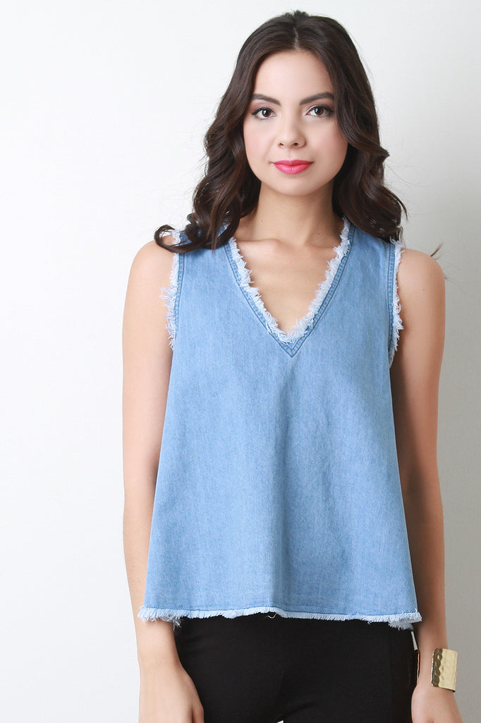 This sleeveless top features a denim fabrication, v neckline, flare cut, frayed hem, with an open back. Accessories sold separately. 100% Cotton.