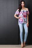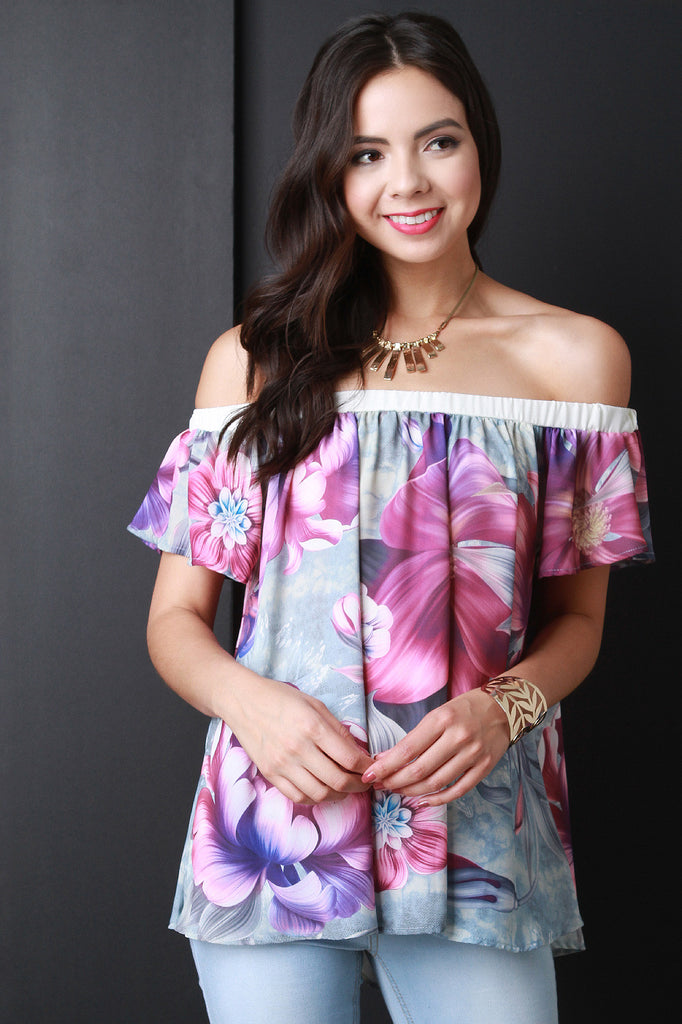 This lovely top features floral print, elasticized off the shoulder neckline, short sleeves, and relaxed fit. Accessories sold separately. Made in USA. 100% Polyester.