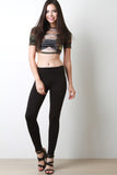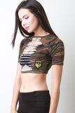 This top features camouflage print, crew neck, short sleeves, crop hemline, center rip construction, and sergeant patch at left side. Accessories sold separately. Made in U.S.A. 95% Cotton, 5% Spandex.