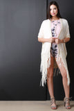 This kimono features a knit fabrication, crochet contrast trim, fringe detail and a center back lace cut out, open front, and a over-sized silhouette. Accessories sold separately. Shell: 95% Modal 5% Spandex. Contrast: 100% Polyester.