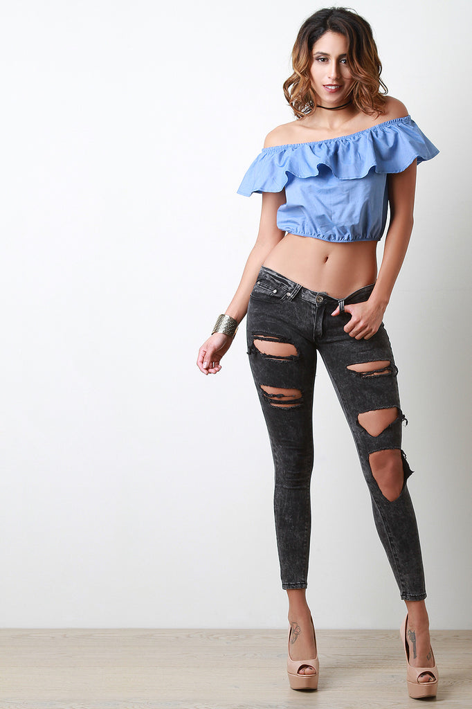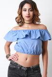This crop top features a off the shoulder design, ruffle trim elastic neckline, with a cropped elastic hem. Accessories sold separately. Made in U.S.A. 94% Cotton, 6% Spandex.