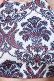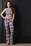 This crop top features smooth stretch fabric, jacquard print, halter neck, and self-lace up back. Accessories sold separately. Made in USA. 95% Polyester, 5% Spandex.