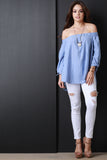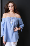 This breezy summer blouse features a woven fabrication, stripe print, off the shoulder elastic neckline, tie cuff long sleeves, loose fit with a rounded high low hemline. Accessories sold separately. 100% Cotton.