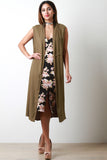This sleeveless vest features a contrasting collar neckline, longline construction, open front, and trench inspired seam at waist. Accessories sold separately. Made in U.S.A. 100% Rayon. Contrast: 95% Polyester, 5% Rayon.