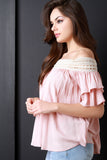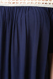 This relaxed top features a textured woven fabric, off the shoulder neckline with crochet trim detail, and ruffle layered short sleeves. Accessories sold separately. Made in U.S.A. 100 % Rayon.