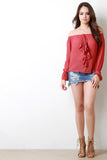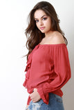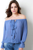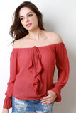 This top features a flowy woven fabrication, elasticized off the shoulder neckline, ruffle front detail with self-tie ribbon, and puffed longsleeves. Finished with a rounded hemline. Accessories sold separately. 100% Polyester.
