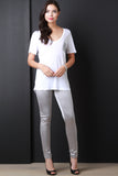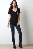 This feather weight t-shirt features a v-neckline, short sleeves, contrasting breast pocket, and a relax cut fit. Accessories sold separately. Made in U.S.A. 100% Rayon.