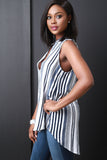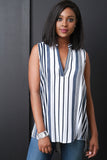 This sleeveless top features a half-placket v-neckline, flat collar, vertical stripes, and a high low hemline. Accessories sold separately. Made in U.S.A. 100% Cotton.