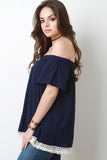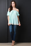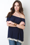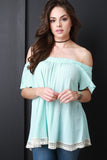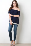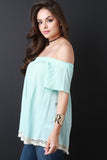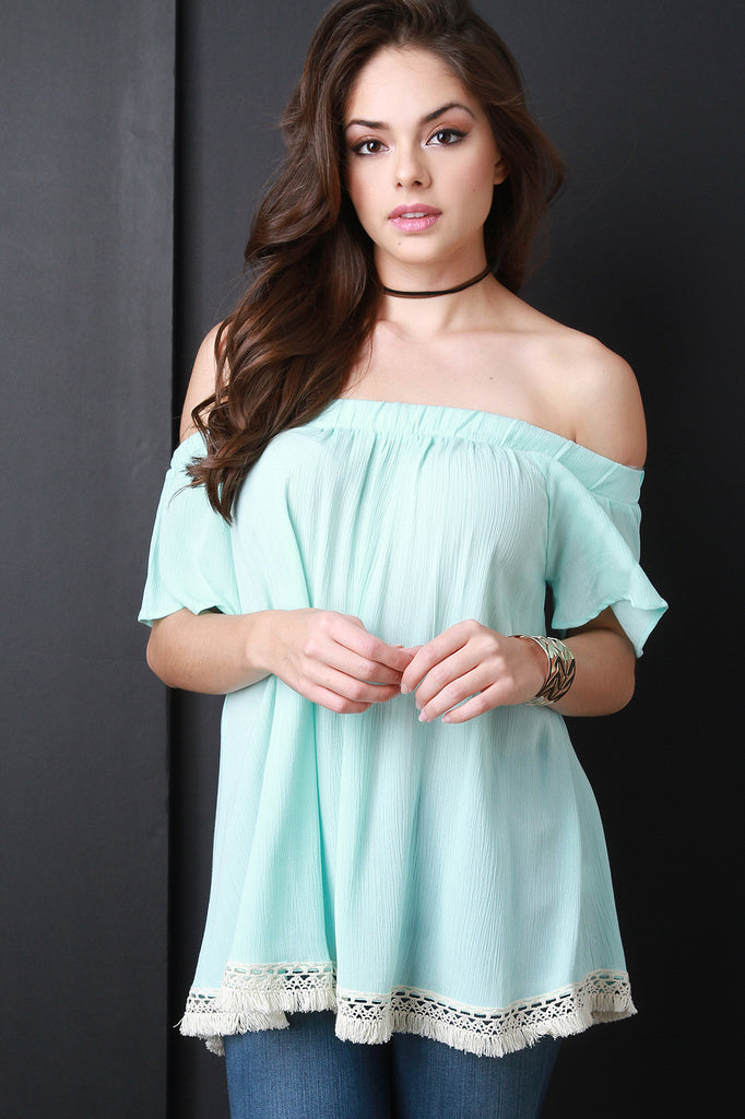 This bardot top features a wide elasticized off the shoulder neckline, short sleeves, shift fit, and contrasting fringe trimming. Accessories sold separately. Made in U.S.A. 100% Rayon.