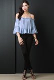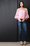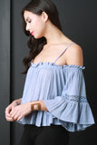 This beautiful blouse top features a crinkled fabric with lace inset, elasticized neckline, bell sleeves, cold shoulder design with an adjustable straps, and ruffle hem. Accessories sold separately. 100% Rayon.