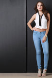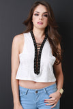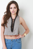 This crop top features lightweight distressed fabric, lace up front, and sleeveless construction. Made in USA. 100% Cotton.