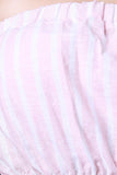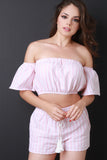 This crop top features lightweight fabric, vertical stripe, elasticized off the shoulder neckline, and short sleeves. Accessories sold separately. Made in USA. 100% Cotton.