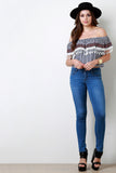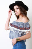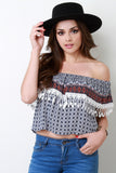 This crop top features a boho print pattern, off the shoulder elasticized neckline, and ruffled layer with crochet lace trimming. Accessories sold separately. 100% Rayon.