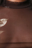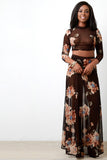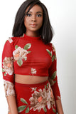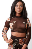 This crop top features a semi-sheer mesh fabric printed with floral patterns, mock neckline, and three quarter sleeves finish. Accessories sold separately. Made in U.S.A. 100% Polyester.