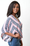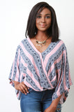 This breezy blouse features a surplice style v neckline, with an adjustable snap closure, boxy loose silhouette, wide half sleeves and a rounded back hemline. Accessories sold separately. 100% Rayon.
