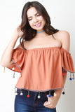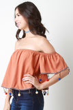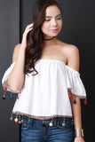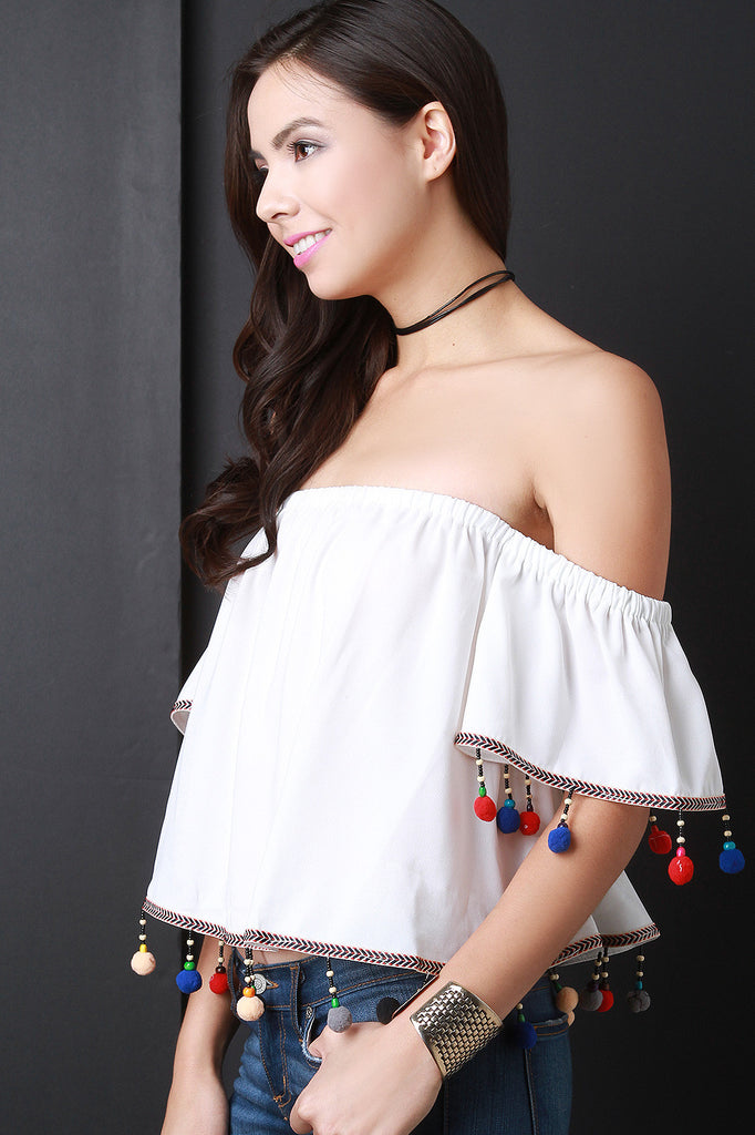 This bardot top features and elasticized off-the shoulder neckline, short flutter sleeves, ribbon trimming, and beaded multicolor pom pom fringe at hemline. Accessories sold separately. 100% Polyester.