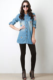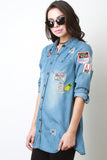 This chambray top features a button-up front to a collar neckline, long sleeves with button tab cuff option, distress front, double breast pockets, and miscellaneous patches throughout. Accessories sold separately. 70% Rayon, 30% Polyester.