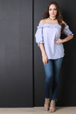 This top features off the shoulder ruffle neckline, half sleeves, and relaxed fit. Accessories sold separately. Made in USA. 100% Cotton.