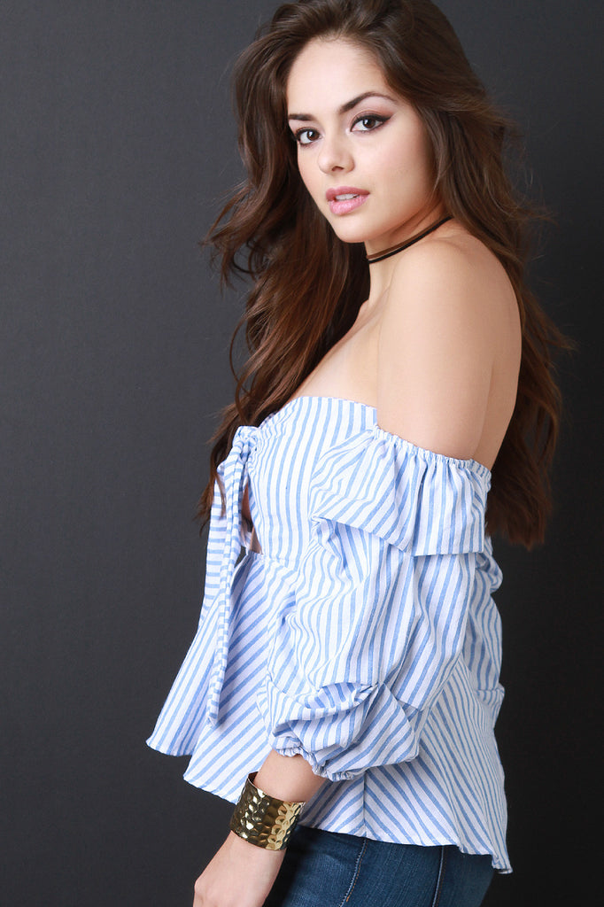 This woven top features a sweetheart neckline with a self tie bow at front and a key hole opening. Designed with ruffle puffed three quarter sleeves and elasticized ends. Peplum hemline. Flare cut. Finished with an adjustable back zipper. Accessories sold separately. 100% Cotton.