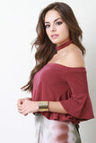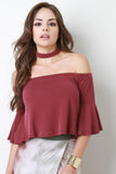 This crop top is flare cut, featuring an off the shoulder elasticized band design. Designed with quarter bell sleeves. Comes with a fabric choker. Stretchy soft knit, unlined. Accessories sold separately. 95% Rayon. 5% Spandex.