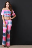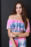 This crop top features an elasticized off-the-shoulder ruffled neckline, soft jersey knit with colorblock tie dye coloring, and a cropped hemline. Accessories sold separately. Made in U.S.A. 96% Rayon, 4% Spandex.