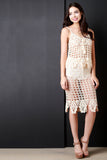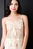 This daring top features a crochet knit construction, thin shoulder straps, scalloped hemline, and deep v-neckline with self-tie tassel lace detail. Accessories sold separately. 100% Acrylic.