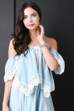 This bardot top features chambray fabric, elasticized off the shoulder neckline, short sleeves, asymmetrical hem, and crochet accents. Accessories sold separately. Outshell: 100% Cotton. Contrast: 100% Polyester.