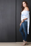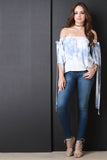 This trendy bardot top features cloudy tie dye, elasticized off the shoulder neckline, and half sleeves with self-tie bows. Accessories sold separately. 100% Rayon.
