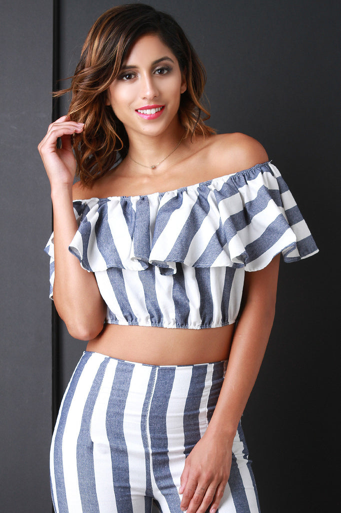 This striped bardot top features an elasticized off the shoulder neckline, flutter sleeves, and a crop elastic hemline. Accessory sold separately. Made in U.S.A. 100% Cotton.