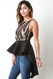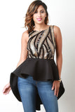 This sleeveless top features a round neckline, scoop back, metallic sequins and floral embroidery details on semi-sheer mesh fabrication, cinched waist seam, finished with a high low scuba knit peplum hem. Accessory sold separately. Made in U.S.A. 95% Polyester, 5% Spandex.