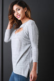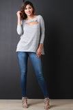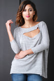 This dolman long sleeve top features soft melange knit, boat neckline, front cutout, and back cutout. Accessories sold separately. Made in USA. 48% Rayon, 36% Cotton, 16% Polyester.