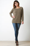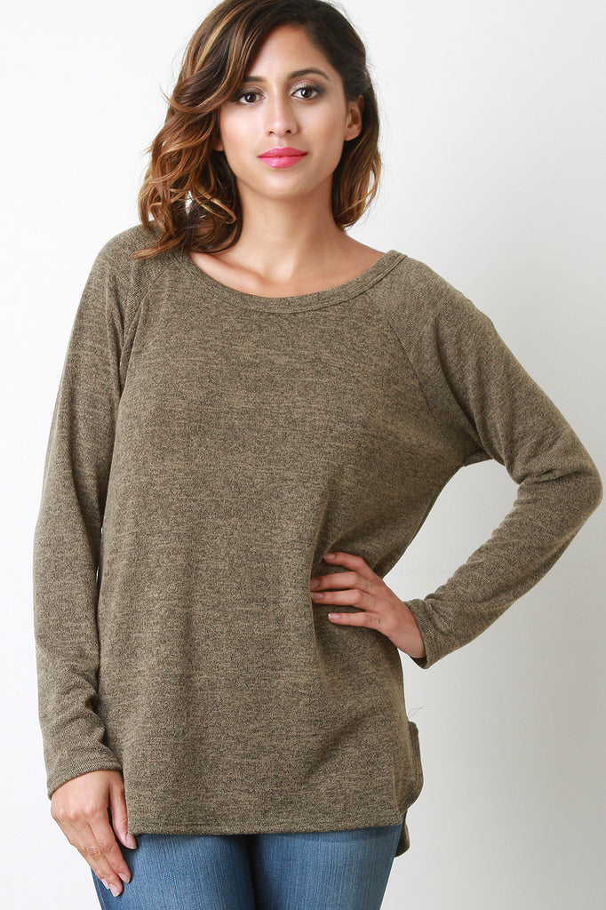 This soft top features a soft knit fabrication, round neckline, and deep v back with buttons accent. Finished with long sleeves and curved hemline. Accessories sold separately. Made in U.S.A. 96% Polyester, 4% Spandex.