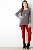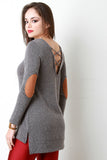 This trendy sweater features a soft knit fabric, crisscross back detail, boat neckline, and longsleeves with elbow patch design. Finished with a high-low hemline. Accessories sold separately. Made in U.S.A. 96% Polyester, 4% Spandex.
