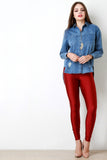 This trendy jacket features a distressed design, two front pockets, button-up with classic collar, button-ended longsleeves, and back pleating. Finished with a high-low hemline with rounded back. Accessories sold separately. 98% Cotton, 2% Spandex.