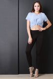 This crop top is t-shirt silhouette, featuring a round neckline with short sleeves. Designed with a self tie knot at front and a functional hidden zipper down the back. Woven knit fabrication, unlined. Mixed vertical stripe print throughout. Accessories sold separately. 100% Cotton.