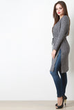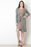 This cardigan features a marled rib knit fabrication, open front, self tie string belt, center back box pleat, long sleeves, knee length hemline, and double side slits. Accessories sold separately. Made in U.S.A. 57% Rayon, 40% Polyester, 3% Spandex.