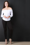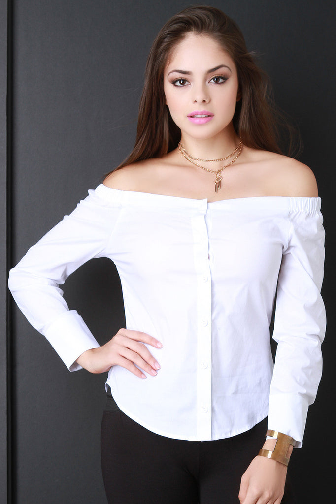 This trendy top features an off the shoulder neckline, button up front, rounded hemline, slim fit, and button cuff. Accessories sold separately. 100% Cotton.
