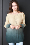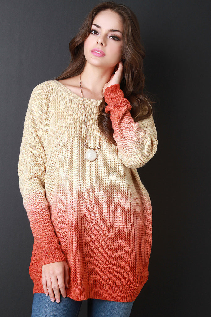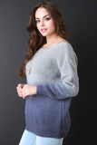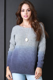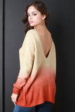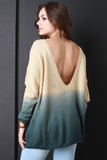 This knitted sweater top features a round ribbed knit neckline, deep v-back, long sleeves, and ombre dip dyed design. Accessories sold separately. 75% Acrylic, 25% Mohair.