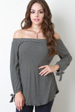 This top has an off the shoulder elasticized neckline with long sleeves that feature a self tie bow tie. Long-line silhouette with side cutouts at curved hemline. Soft knit ribbed fabrication, unlined. Striped print throughout. Accessories sold separately. 70% Rayon. 15% Cotton. 15% Modal.