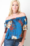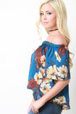 This top features a floral printed chiffon fabric, elasticized off the shoulder neckline, short sleeves, and high-low hemline. Accessories sold separately. 100% Polyester.