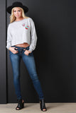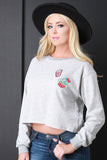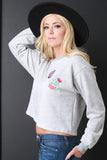 This edgy sweatshirt features a soft knit fabrication with popcorn and cupcake patches at front, crew neckline, long sleeves with ribbed cuff, and cropped hem. Accessories sold separately. Made in U.S.A. 61% Cotton, 39% Polyester. Contrast: 96% Rayon, 4% Spandex.