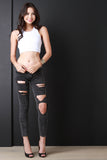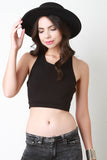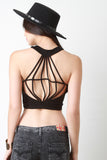 This sleeveless top features a round neckline, diamond caged back design, crop hem with a wide seam panel. Accessories sold separately. Made in U.S.A. 68% Rayon, 27% Nylon, 5% Spandex.