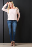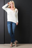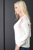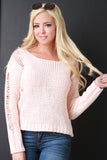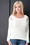 This sweater is soft ribbed knit design with distressed accents throughout. Pull over style. Cozy fit, unlined. Round neckline, long sleeves. Accessories sold separately. 100% Acrylic.