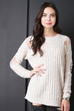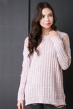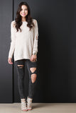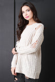 This pullover sweater is slouchy over sized silhouette, featuring distressed areas throughout. Stretchy, soft knit, unlined. Long sleeves. Accessories sold separately. 80% Acrylic, 20% Polyester.