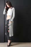 This cardigan features melange rib knit, open front, long sleeves, two pockets, and longline construction. Accessories sold separately. Made in USA. 80% Cotton, 20% Polyester.