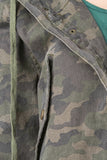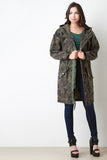 This longline jacket features camouflage print, button-up front with zipper underneath, drawstring hood, drawstring waist, and pockets. Accessories sold separately. 100% Cotton.