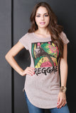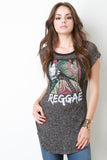 This trendy long tee features a soft marled knit fabric, reggae graphic print at front, contrast round neckline, and cap sleeves. Finished with a rounded hemline. Accessories sold separately. Made in U.S.A. 100% Polyester.