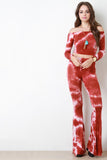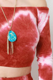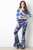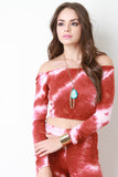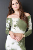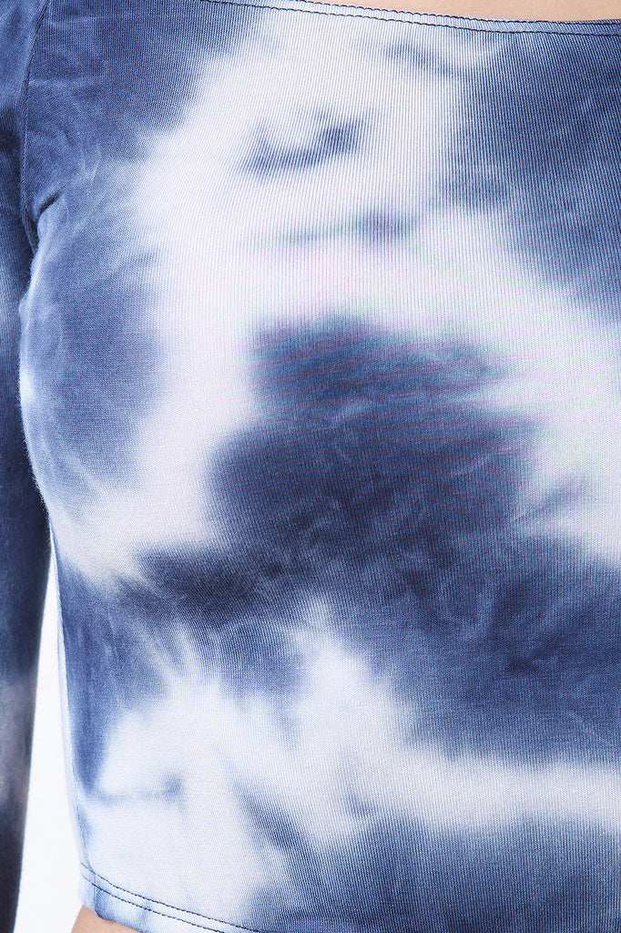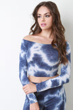This crop top features a jersey knit fabric, cloudy tie dye print, off the shoulder neckline, and longsleeves construction. Accessories sold separately. Made in U.S.A. 95% Rayon, 5% Spandex.