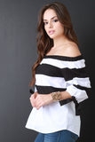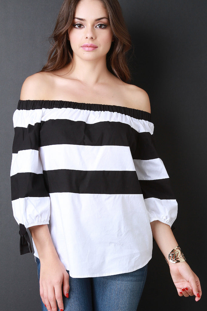 This blouse features an off the shoulder neckline, woven fabrication, elastic neckline and cuffs, bold pieced stripe pattern, finished with a bow detail on the cuff. Accessories sold separately. Made in U.S.A. 98% Cotton 2% Spandex.