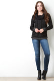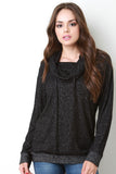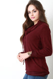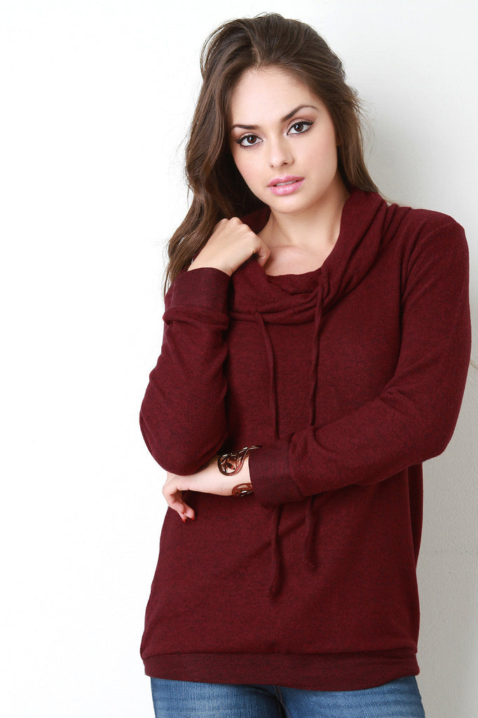 This sweater features a soft knit fuzzy fabrication, long sleeve, reversed contrast cuffs and hem, draped cowl collar with a drawstring, and a loose relaxed fit. Accessories sold separately. Made in U.S.A. 70% Rayon, 25% Polyester, 5% Spandex.